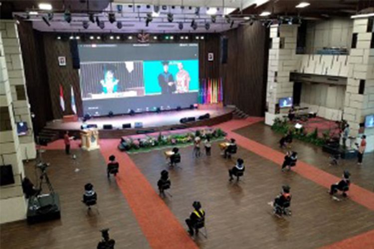 Bagian dari adaptasi kebiasaan baru, UK Maranatha melaksanakan upacara wisuda (Sabtu, 15/8/2020) memanfaatkan media daring dan menerapkan protokol kesehatan secara ketat. (Dok. Medkom Maranatha)