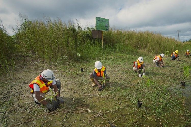 Ilustrasi pekerja pertambangan yang sedang melakukan penghijauan.