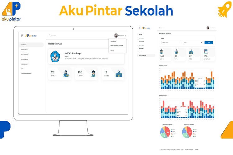 Tampilan dashboard aplikasi berbasis web Aku Pintar Sekolah yang dapat men-digitalisasi proses laporan Kegiatan Belajar Mengajar (KBM). Melalui Aku Pintar Sekolah, pihak sekolah dapat mengetahui rekam data KBM baik yang sudah dan akan berlangsung, memudahkan guru dalam menjadwalkan KBM serta memudahkan siswa juga dalam melihat jadwal. (Dok. Aku Pintar Indonesia)()