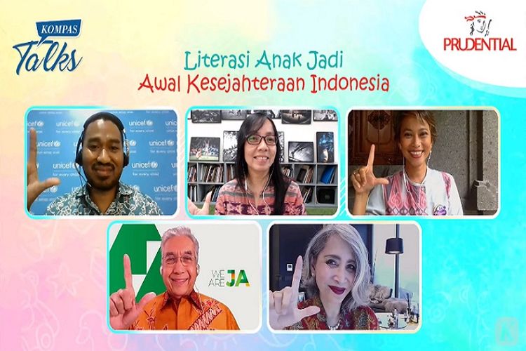 Para pembicara web seminar KompasTalks 'Literasi Anak Jadi Awal Kesejahteraan Indonesia' yang terdiri dari Chief Field Office Unicef wilayah Papua Aminuddin Ramdan (kiri atas), pegiat literasi sekaligus Pendiri Taman Bacaan Pelangi Nila Tanzil (kanan atas), Ketua Dewan PJI Siddharta Moersjid (kiri bawah), dan Sharia, Government Relations and Community Investment Director Prudential Indonesia Nini Sumohandoyo (kanan bawah). ((Dok. Kompas) )