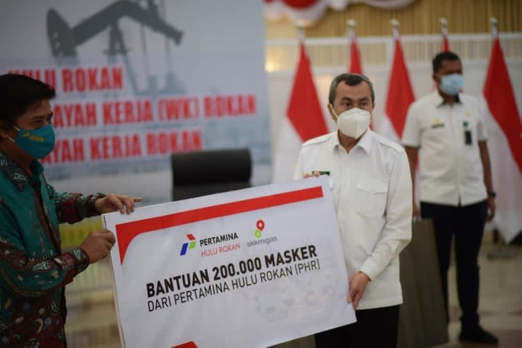 PT Pertamina Hulu Rokan (PHR) berikan bantuan 200.000 masker untuk masyarakat di wilayah kerja (WK) Rokan dalam courtesy visit di Gedung Daerah Pauh Janggi Gubernuran, Pekanbaru, Rabu (11/11/2020) (Dok. Pertamina)