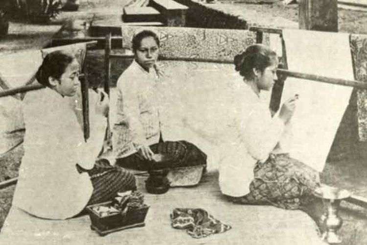 Kartini sedang membatik dengan adik-adiknya Rukmini (tengah) dan Kardinah (kiri).