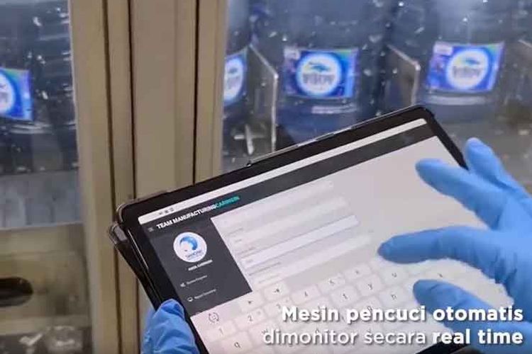 Mesin pencuci galon otomatis Aqua dimonitor secara real time.