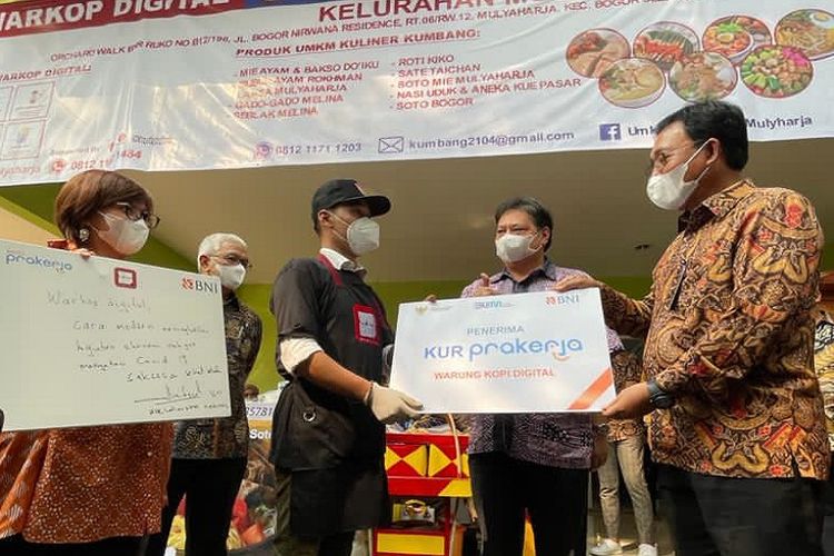 Menteri Koordinator Bidang Perekonomian RI Airlangga Hartarto (tengah) dan Direktur Hubungan Kelembagaan BNI Sis Apik Wijayanto (kanan) saat menyerahkan insentif Kredit Usaha Rakyat (KUR) kepada alumni Program Kartu Prakerja.