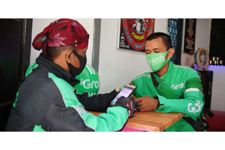Mitra pengemudi Grab sedang menunggu pesanan makanan.