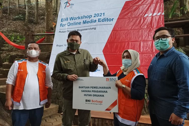 Pemimpin Hutan Organik Megamendung Rosita (kedua dari kanan) dan Group Head Tanggung Jawab Sosial dan Lingkungan (TJSL) PT Bank Negara Indonesia (BNI) Kliko Mulyono (kedua dari kiri) saat menunjukkan tanda kolaborasi tetap di Megamendung, Kabupaten Bogor, Sabtu (19 Juni 2021).(DOK. Humas Bank Nasional Indonesia)