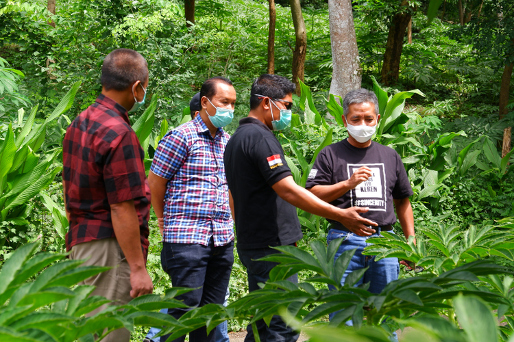 Direktur Bisnis Mikro BRI Supari sedang berdiskusi denganketua kelompok petani porang Desa Klangon.