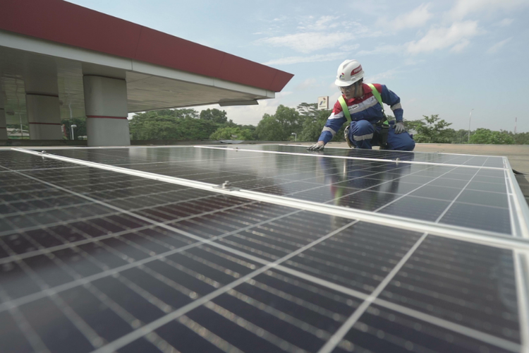 Pekerja Pertamina sedang melakukan pemasangan solar photo voltaic. (DOK. Pertamina)