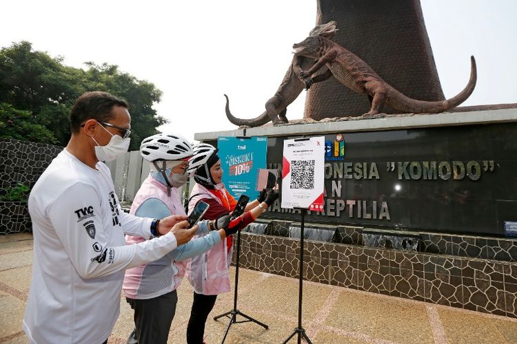 Wakil Direktur Utama BNI Adi Sulistyowati (kanan), Direktur Bisnis Konsumer BNI Corina Leyla Karnalies (tengah), Direktur Eksekutif TMII I Gusti Putu Ngurah Sedana (kiri) melakukan pembelian tiket masuk Museum Komodo di Taman Mini Indonesia Indah menggunakan QRIS melalui BNI Mobile Banking, Jakarta, Sabtu (2/10/2021).(Dok. BNI)