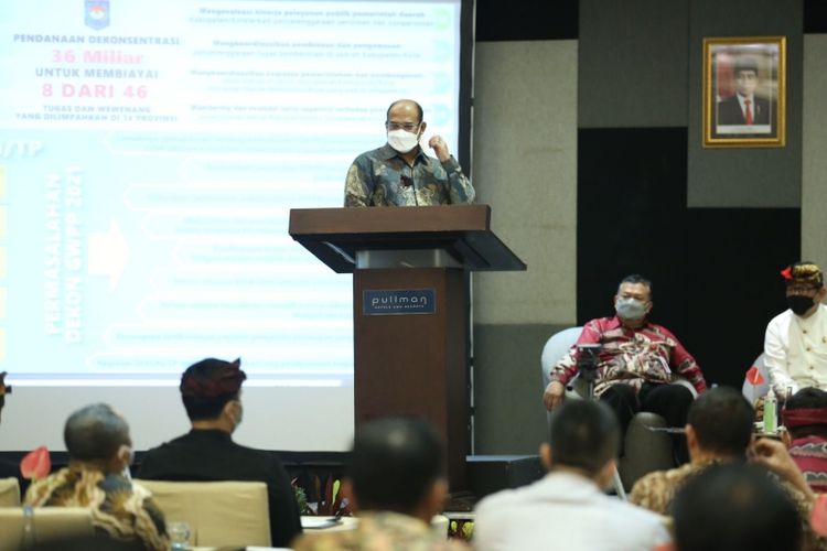 Direktur Jenderal (Dirjen) Bina Adwil Kemendagri Safrizal ZA saat berada di Rapat Monitoring dan Evaluasi (Monev) Pelaksanaan Tugas dan Wewenang Gubernur sebagai Wakil Pemerintah Pusat.