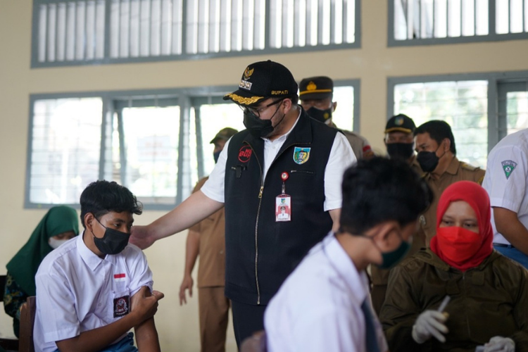 Bupati Kediri Hanindhito Himawan Pramana tinjau penyelenggaraan vaksinasi dosis kedua untuk pelajar di SMA Negeri (SMAN) 1 Plosoklaten, Kabupaten Kediri, Selasa (19/10/2021).