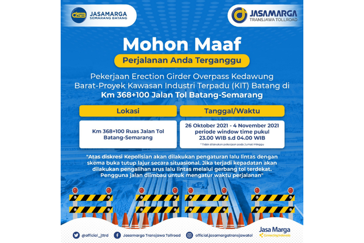 Pengunguman pekerjaan erection girder di kilometer (KM) 368+100 Jalan Tol Batang-Semarang