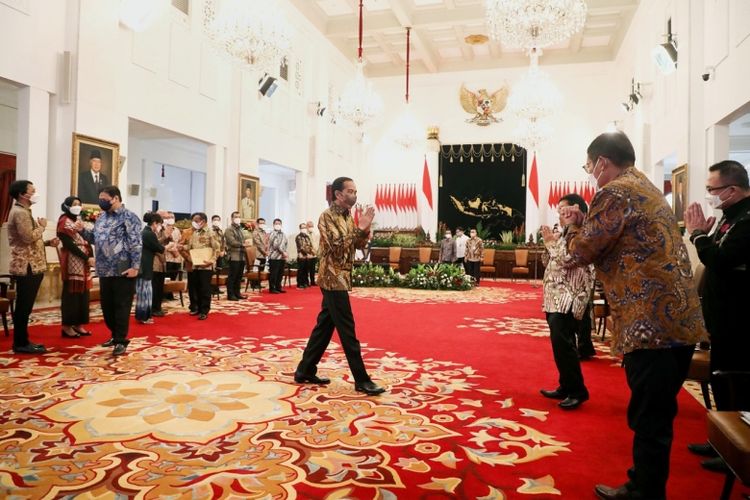 Presiden Joko Widodo (Jokowi) memberikan sambutan ke sejumlah pihak saat pelaksanaan Kompas100 CEO Forum ke-12 Powered by East Ventures.