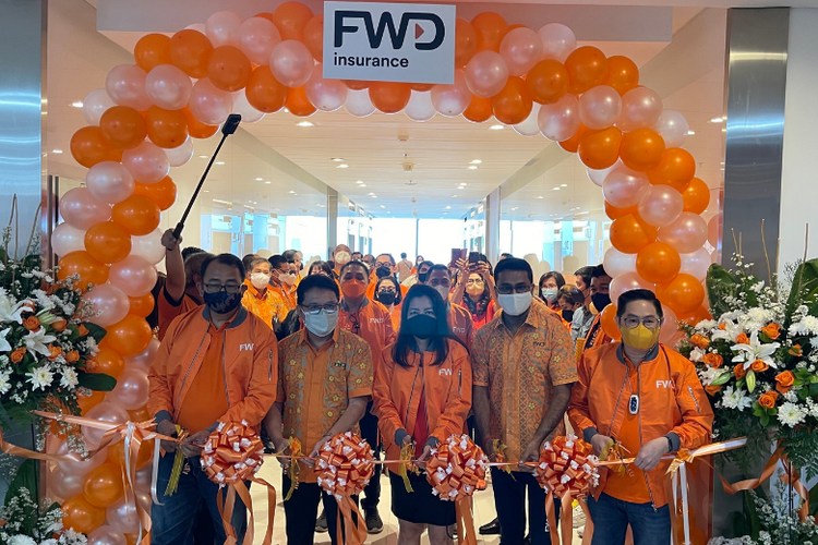 Direktur Utama PT FWD Insurance Indonesia Anantharaman Sridharan (keempat kiri) melakukan pemotongan pita saat meresmikan lokasi baru Kantor Pemasaran FWD Insurance cabang Jakarta di Neo Soho Capital lantai 12, Jakarta Barat, disaksikan oleh para agen. (DOK. FWD Insurance)