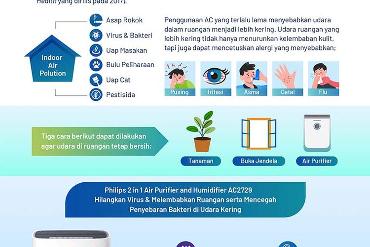 Philips 2 in 1 Air Purifier and Humidifier AC2729 dapat membantu untuk menghilangkan virus dan melembabkan udara dalam ruangan serta mencegah penyebaran bakteri di udara kering.
