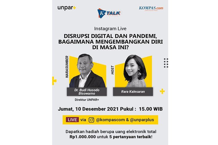 Instagram Live KTalk bertajuk ?Pengembangan Diri di Masa Disrupsi Digital? di akun Instagram @kompascom dan @unparplus, Jumat (10/12/2021).
