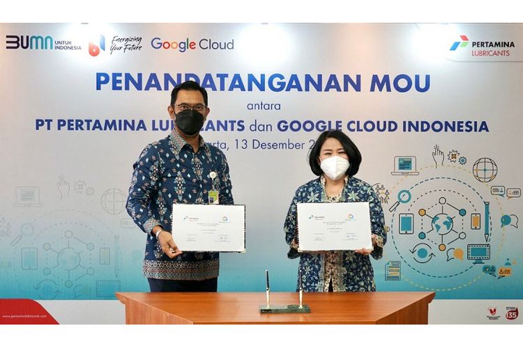 Penandatanganan MoU kerja sama oleh Direktur Finance and Business Support PTPL Catur Dermawan dan Country Director Google Cloud Indonesia Megawaty Khie (Dok. Pertamina)