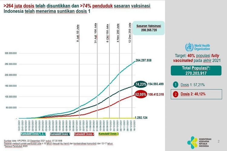 Hingga Rabu (22/12/2021), total masyarakat Indonesia yang sudah mendapat suntikan dosis lengkap (fully vaccinated) mencapai 108.412.315 orang atau 40,12 persen.