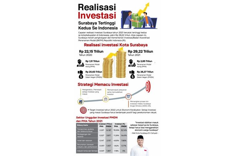 Walkot Eri menuturkan, nilai realisasi investasi Kota Pahlawan pada 2021 berasal dari sejumlah sektor, mulai dari infrastruktur, transportasi, hotel, restoran, kesehatan, hingga perdagangan.