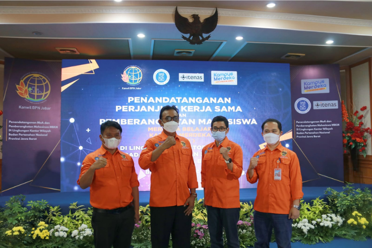 Dari kiri ke kanan, Kepala Bidang Survei dan Pemetaan Hesekiel Sijabat, Kepala Kanwil BPN Provinsi Jabar Dalu Agung Darmawan, Dekan Fakultas Ilmu dan Teknologi Kebumian ITB Irwan Meilano, dan Dekan Fakultas Teknik Sipil dan Perencanaan Itenas Bandung Soni Darmawan.