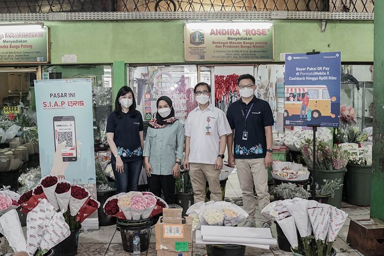 Vivi Budijanto - Head Merchant Business Divisi Digital Business PermataBank (pertama dari kiri),Yufrizal - Kepala Divisi Perizinan dan Implementasi Kebijakan Sistem Pembayaran Kantor Perwakilan BI DKI Jakarta (ketiga dari kiri), dan Eric Sutanto - Head, Consumer Lending Sales & National Sales Exhibition PermataBank (pertama dari kanan), mengunjungi salah satu merchant PermataQR di Pasar Bunga Rawa Belong, Jakarta.(Dok. PermataBank)