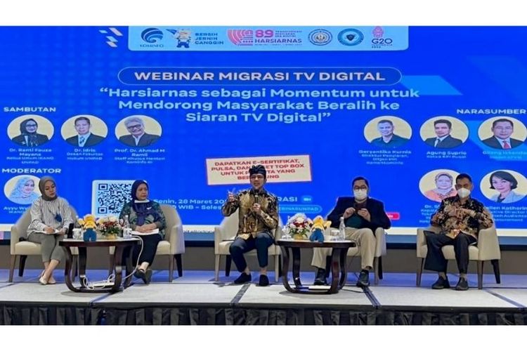 Ketua KPI PUsat Agung Suprio (tengah) memberikan paparan dalam Webinar Migrasi TV Digital di Bandung, Senin (28/3/2022).