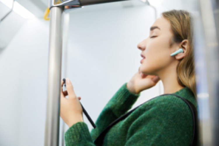 Ilustrasi seseorang menggunakan Huawei FreeBuds SE.