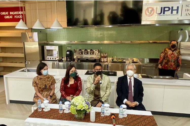 Sandiaga Uno bersama Rektor UPH Dr. (Hon) Jonathan L Parapak, Dekan Fakultas Pariwisata UPH Profesor Diena Mutiara Lemy, serta Executive Director Yayasan Pendidikan Pelita Harapan (YPPH) Stephanie Riady saat melakukan konferensi pers. (Yogarta Awawa Prabaning Arka/Kompas.com)
