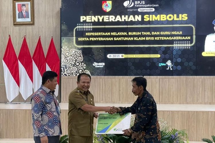 Direktur Kepesertaan BPJAMSOSTEK Zainudin menyaksikan penyerahan kartu peserta oleh Bupati Jember Hendy Siswanto kepada perwakilan peserta.