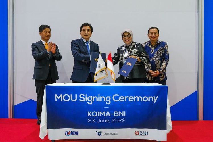 Dari kiri ke kanan, Chairman dan CEO KOIMA Kim Byung-kwan, Executive Vice Chairman KOIMA Kim Young-Sun, Direktur Bisnis Konsumer BNI Corina Leyla Karnalies, serta Duta Besar RI untuk Republik Korea Gandi Sulistiyanto dalam acara penandatanganan Nota Kesepahaman (MOU) antara BNI dengan KOIMA, Kamis (23/6/2022).