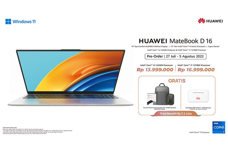 Konsumen Indonesia dapat melakukan pre-order Huawei MateBook D16 pada 27 Juli hingga 5 Agustus 2022.