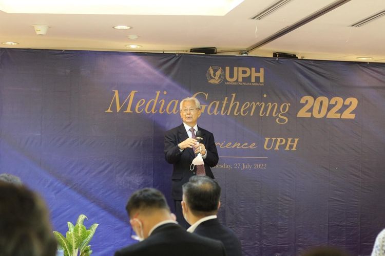 Rektor UPH Jonathan L Parapak memberi sambutan dalam Media Gathering ?Experience UPH? di kampus UPH, Karawaci, Kota Tangerang, Banten, Rabu (27/7/2022)