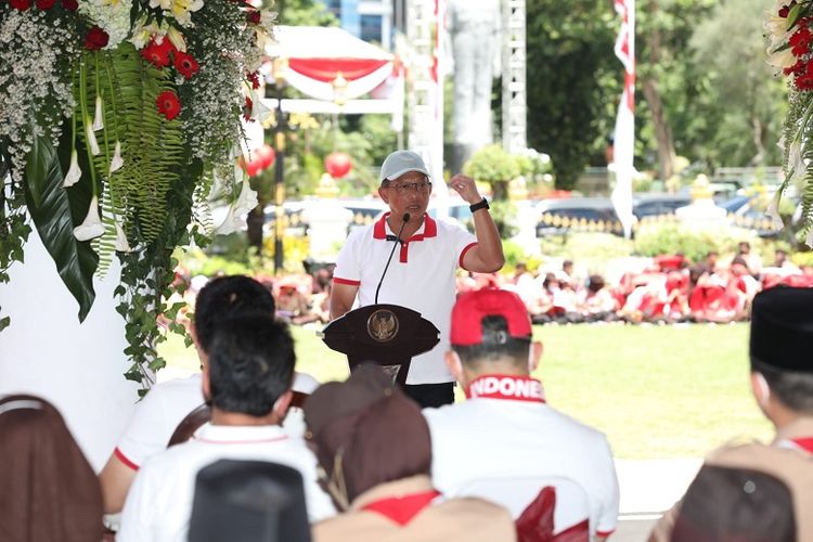 Tito saat memberikan sambutan di Gerakan Pembagian 10 Juta Bendera Merah Putih.