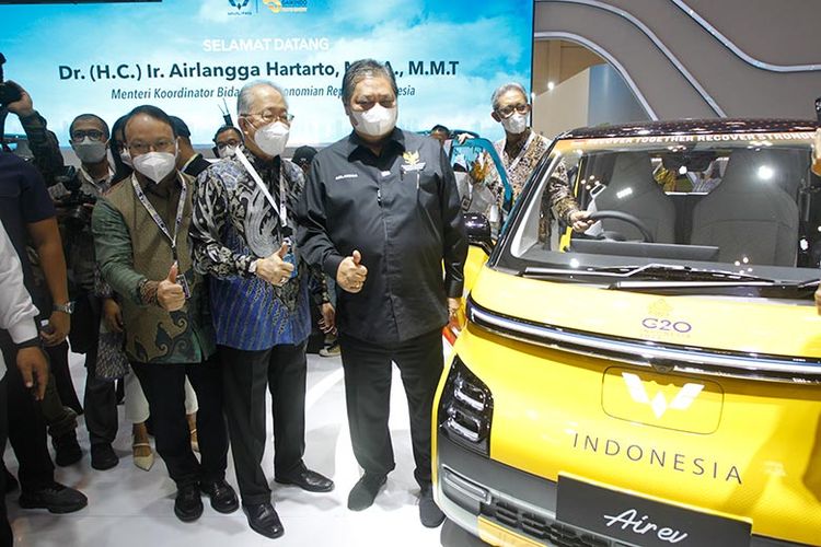 Menko Perekonomian RI Airlangga Hartarto meresmikan produksi kendaraan listrik pertama Wuling, Air ev.