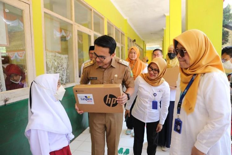Wakil Bupati Kabupaten Bandung Sahrul Gunawan memberikan bantuan bersama para pejabat Taspen.