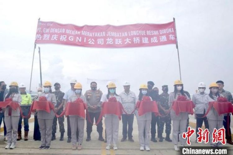 Jembatan Longyue yang dibangun oleh Kawasan Industri Delong Group di Kabupaten Morowali Utara, Indonesia, telah selesai dibangun dan dapat dilalui kendaraan pada 10 September 2022.