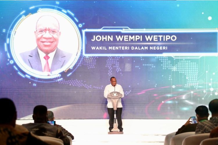 Wamendagri John Wempi Wetipo saat memberi sambutan pada Rapat Koordinasi Pusat dan Daerah (Rakorpusda) Pengendalian Inflasi 2022 di Ballroom Hotel Shangri-La, Surabaya, Jawa Timur, Rabu (14/9/2022).