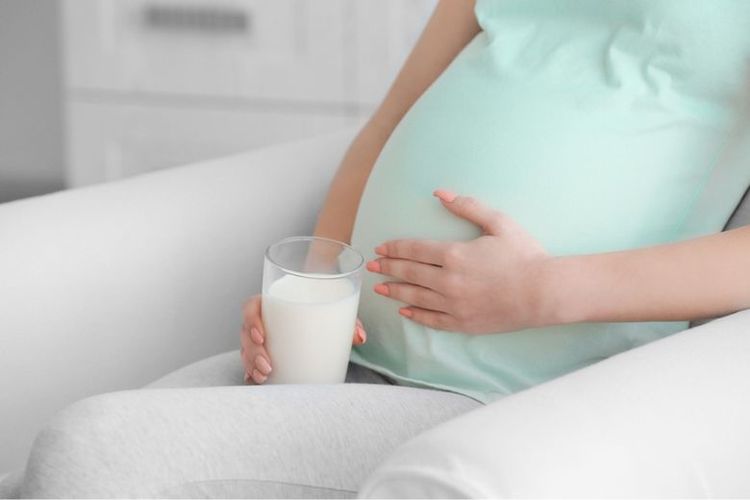 Ilustrasi seorang ibu hamil sedang mengonsumsi susu.