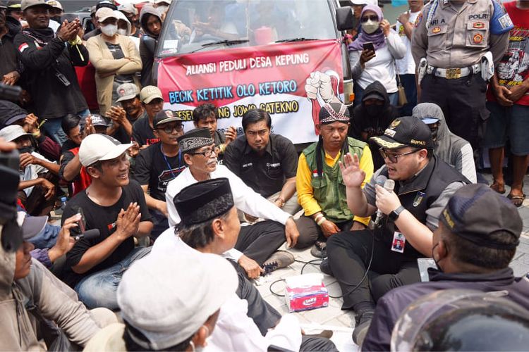 Bupati Kediri Hanindhito Himawan Pramana mendatangi warga yang berunjuk rasa di Kantor Desa Kepung, Kabupaten Kediri, Jawa Timur, Senin (19/9/2022)