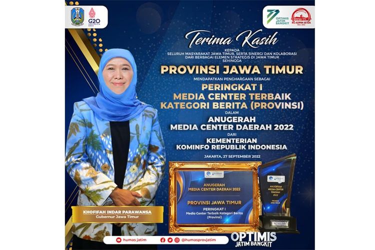 Jatim berhasil meraih Media Center Terbaik Kategori Berita Tahun 2022.