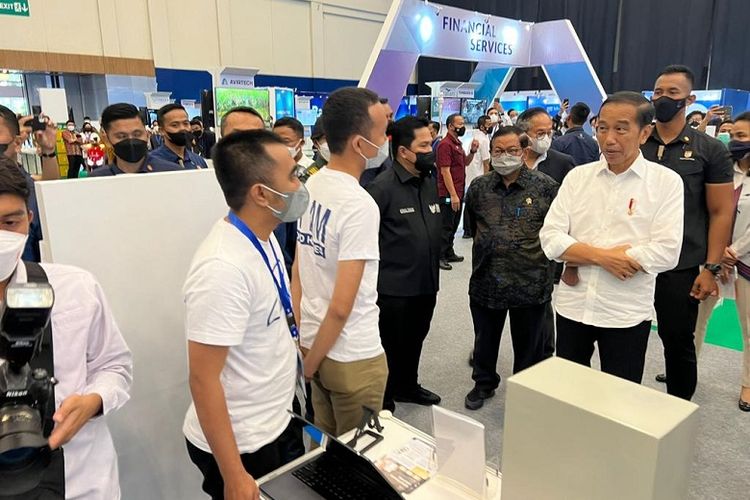 Presiden Joko Widodo saat menyambangi booth Chickin dalam acara BUMN Start Up Day di ICE BSD, Tangerang, Senin (26/9/2022)