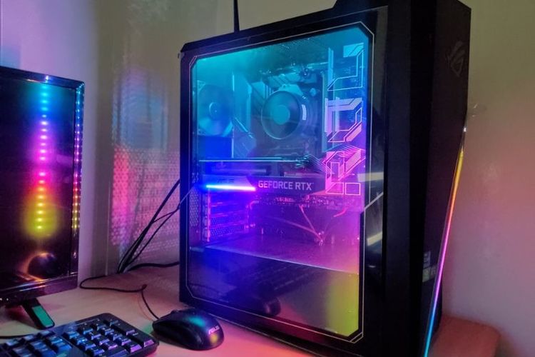 ASUS ROG Strix GT15 G15CF dilengkapi komponen lengkap dengan lampu RGB dan EMI-shielded glass material di panel kiri sasis.