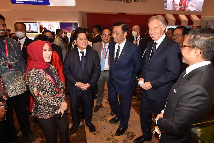 Menko Marves Luhut B Panjaitan bersama menteri BUMN dan Direktur Utama Pertamina Nicke Widyawati pada kegiatan SOE International Conference di Nusa Dua, Bali, Senin (17/10/2022).
