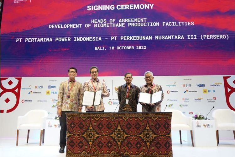 Penandatanganan kerja sama penyediaan biometana terkompresi oleh Pertamina NRE, Pertagas Niaga, PTPN III dalam acara State-Owned Enterprises (SOE) International Conference di Nusa Dua, Bali, Selasa (18/10/2022)