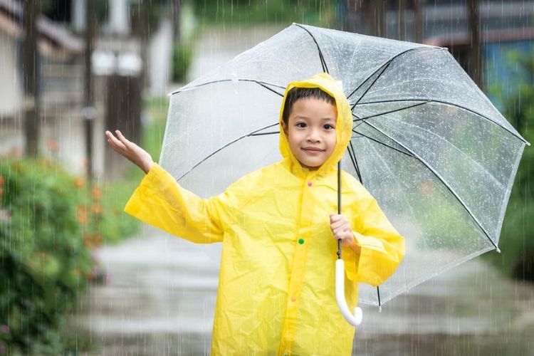 Ilustrasi seorang anak menggunakan perlengkapan musim hujan.