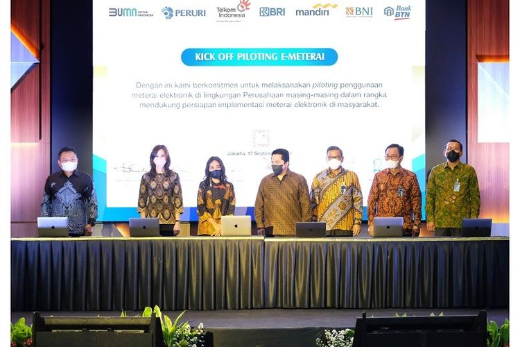 Kick Off Piloting Implementasi Meterai Elektronik di Lingkungan BUMN yang dihadiri oleh Menteri BUMN, Erick Thohir dan perwakilan dari Telkom serta Himbara (BRI, Mandiri, BNI, BTN).