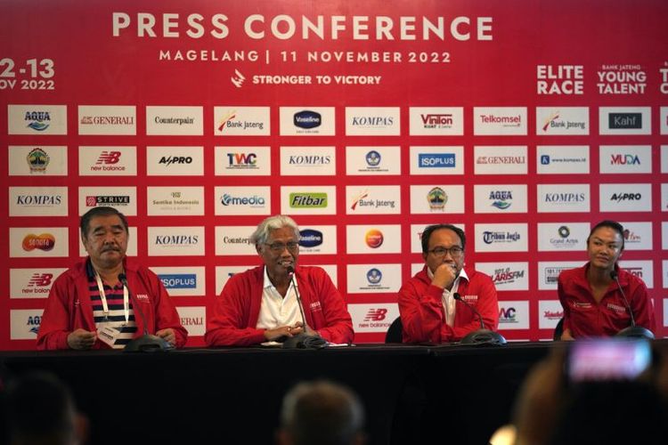 Ketua Yayasan Borobudur Marathon Liem Chi An, Direktur Utama Bank Jateng Supriyatno, Wakil Pemimpin Umum Harian Kompas Budiman Tanuredjo, dan Brand Ambassador Borobudur Marathon 2022 Kelly Tandiono pada konferensi pers di Magelang (11/11/2022)(Dok. Borobudur Marathon 2022)
