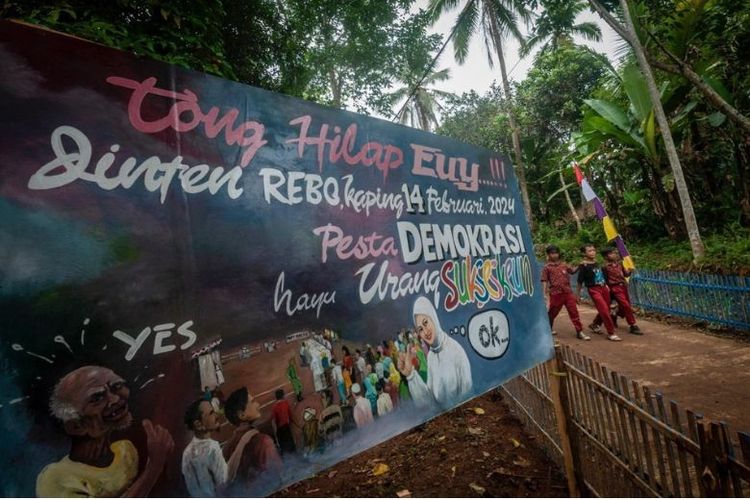 Sejumlah siswa melintas di mural kampung demokrasi di Cileles, Lebak, Banten, Rabu (9/11/2022). Pencanangan Kampung Demokrasi tersebut dalam rangka menggelar sosialisasi serta edukasi pendidikan politik bagi masyarakat guna mensukseskan Pemilu dan Pilkada 2024 yang jujur, adil, dan tidak Golput. (Dok. ANTARA FOTO/Muhammad Bagus Khoirunas/YU)
