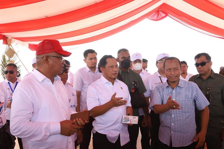 Menteri Dalam Negeri (Mendagri) Tito Karnavian saat meninjau langsung kesiapan acara puncak Sail Tidore 2022 di Pantai Tugulufa, Kota Tidore Kepulauan, Provinsi Maluku Utara, Jumat (25/11/2022).