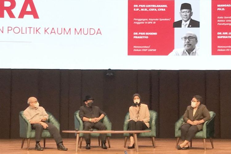 Suasana kegiatan kuliah umum dan bedah Buku Aldera (kiri-kanan), Dekan FISIP Unpar Dr Pius Sugeng Prasetyo, Dekan Fakultas Hukum Unpar Dr Liona Nanang Supriatna, moderator oleh Vida Alatas, dan Ketua Jurusan HI Unpar Elizabeth AS Dewi PhD(Dok. HARIAN KOMPAS)